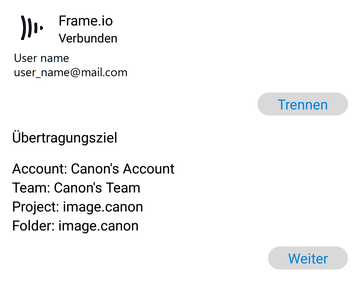 Wählen Sie das Frame.io-Konto aus, an das Sie das Video senden möchten, und klicken Sie auf „OK“. Ihr Frame.io-Kontoname wird angezeigt. Sie können auch die Konten anderer eingeladener Mitglieder auswählen.