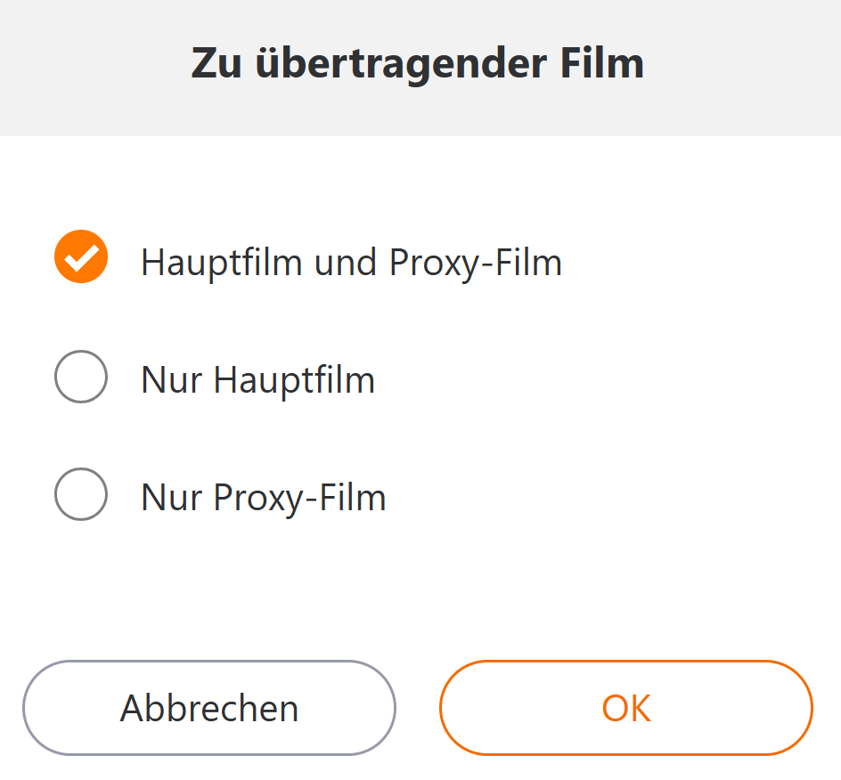 Wählen Sie beim Hochladen der Videodatei, ob das Hauptvideo oder ein Proxy-Video übertragen werden soll. Nur Modelle, die Proxy-Videos unterstützen, können Videos hochladen.