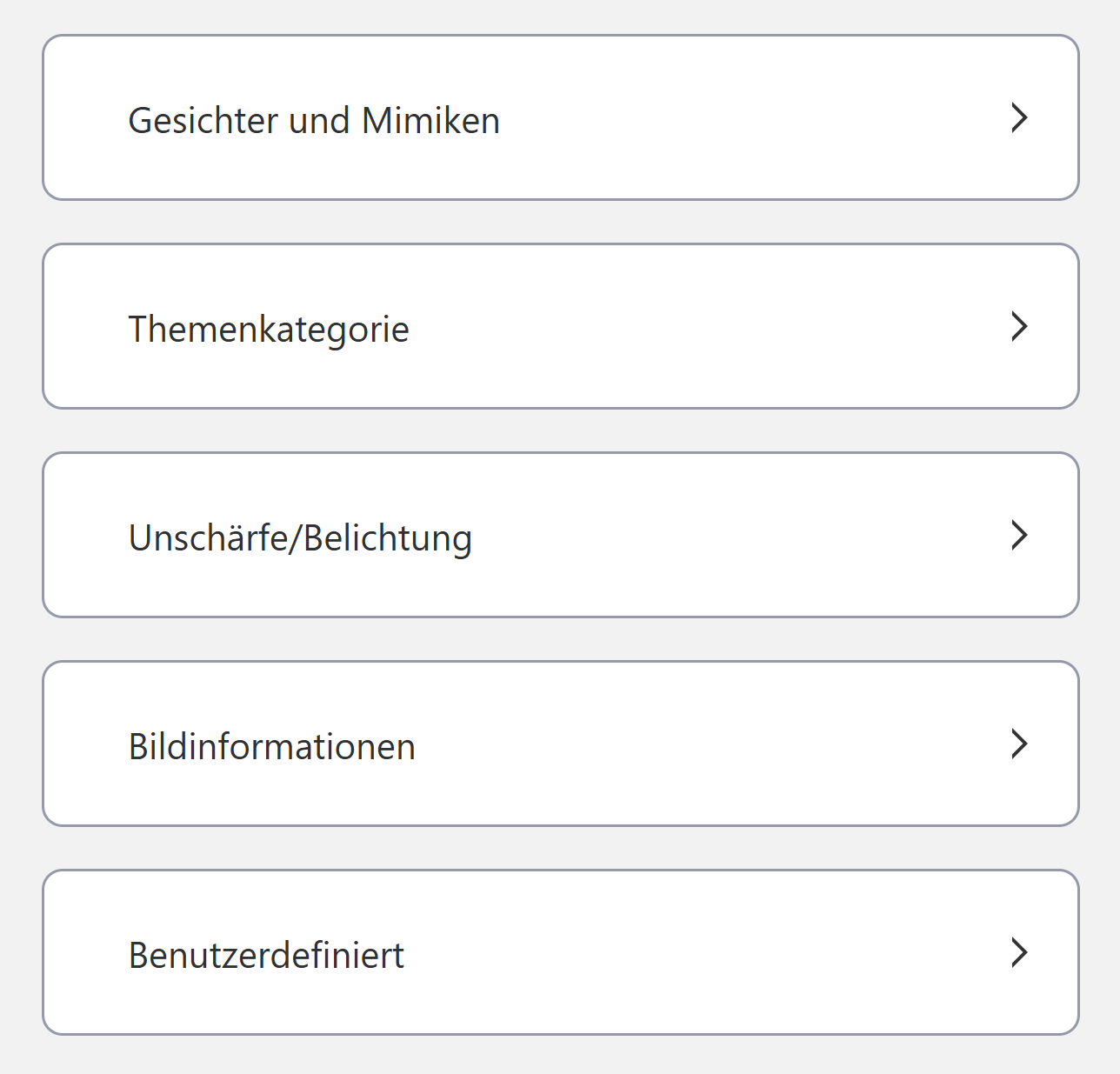 Sie können Bilder in Bilder mit offenen und geschlossenen Augen unterteilen. Wenn ein Auge geöffnet oder die Augenlider nicht vollständig geschlossen sind, gilt das Bild als geschlossen. Wenn Gesichter erfasst sind, gilt ein Bild als mit offenen Augen, wenn mindestens eine der erfassten Personen die Augen geschlossen hat. Wenn keine Gesichter erfasst sind, gilt ein Bild als mit offenen Augen, wenn mindestens eine der erkannten Personen die Augen geschlossen hat. |