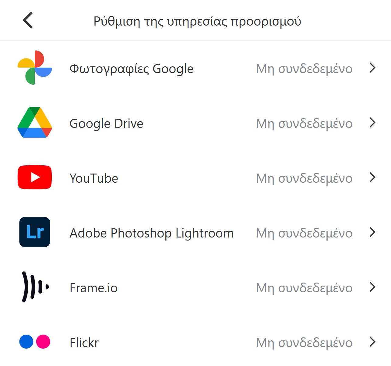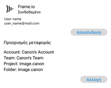Ανοίξτε την οθόνη ρυθμίσεων Frame.io και επιλέξτε "Αλλαγή" ως προορισμό μεταφοράς.
