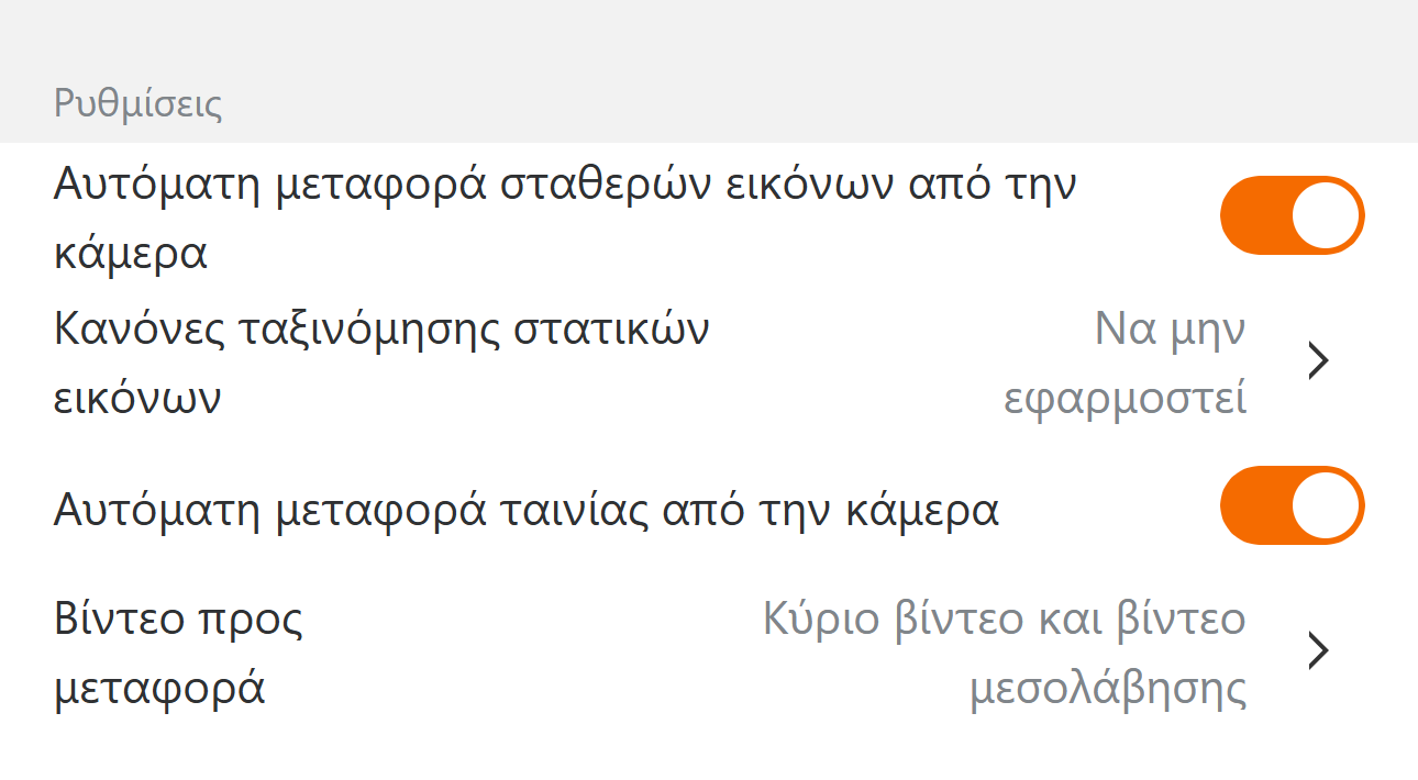 Ρυθμίστε την αυτόματη μεταφορά για στατικές εικόνες και βίντεο ξεχωριστά. Το Google Photos υποστηρίζει μόνο ρυθμίσεις για στατικές εικόνες.