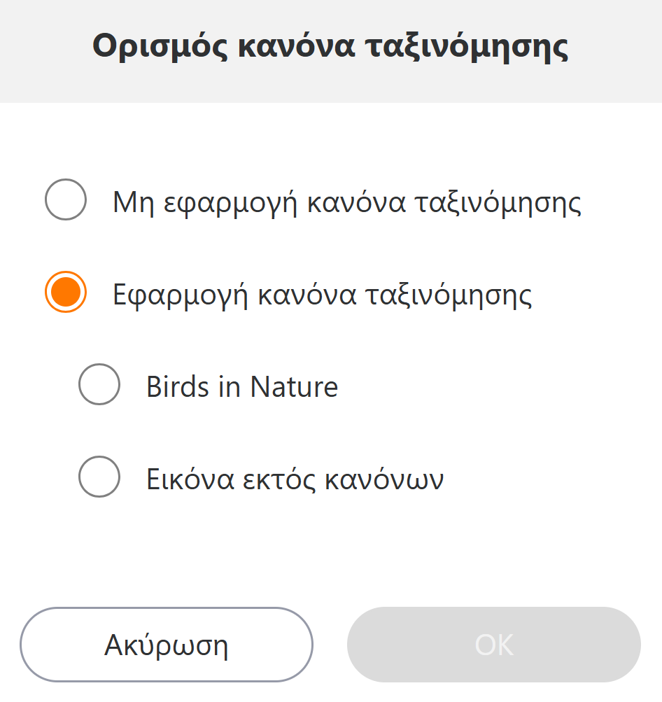 Εάν επιλέξετε [Εικόνες που δεν πληρούν τους κανόνες ταξινόμησης], θα μεταφερθούν εικόνες που δεν ταιριάζουν με κανέναν κανόνα.