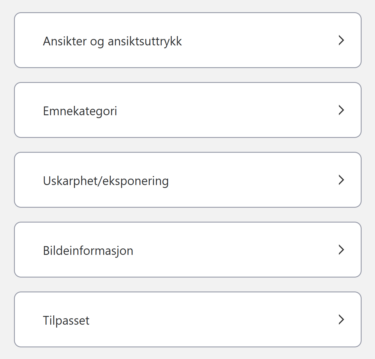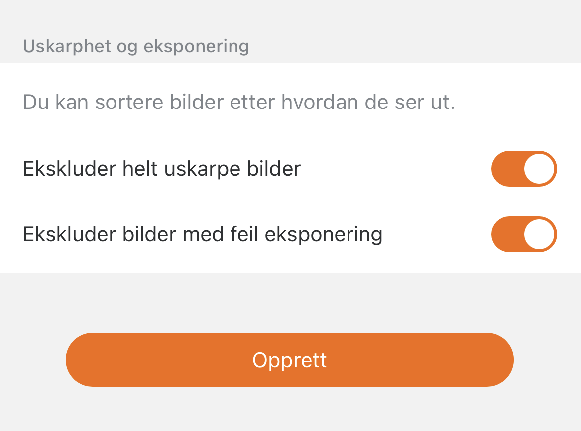 Du kan sortere bilder i de med og uten riktig generell eksponering. Bilder som er tatt i modusen AEB (Auto Exposure Bracketing), anses å være korrekt eksponert. |