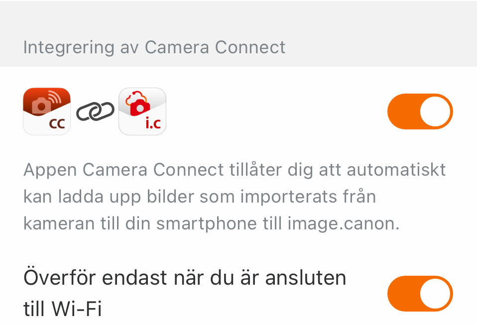 Om du inaktiverar [Upload only when connected to Wi-Fi] laddas bilder upp automatiskt oavsett om du är ansluten till Wi-Fi eller via mobildata. Wi-Fi avser Wi-Fi-anslutningen mellan din mobila enhet och en åtkomstpunkt.