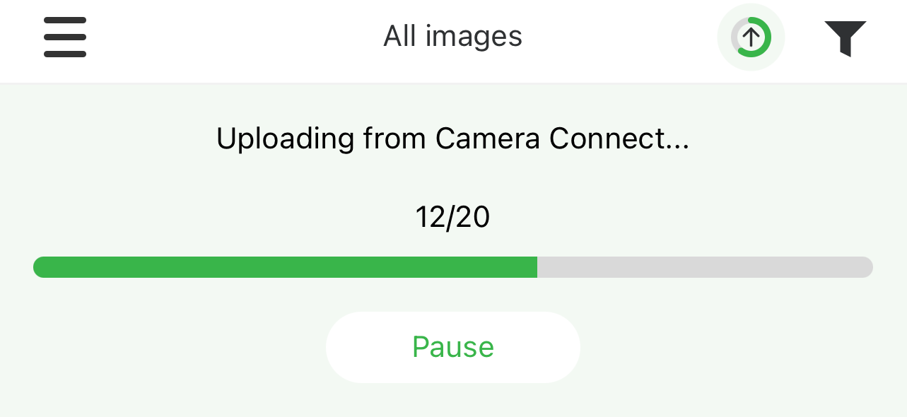 image.canon-appen startas och laddar upp de inmatade bilderna till image.canon. Uppladdningen fortsätter även om image.canon-appen flyttas till bakgrunden.