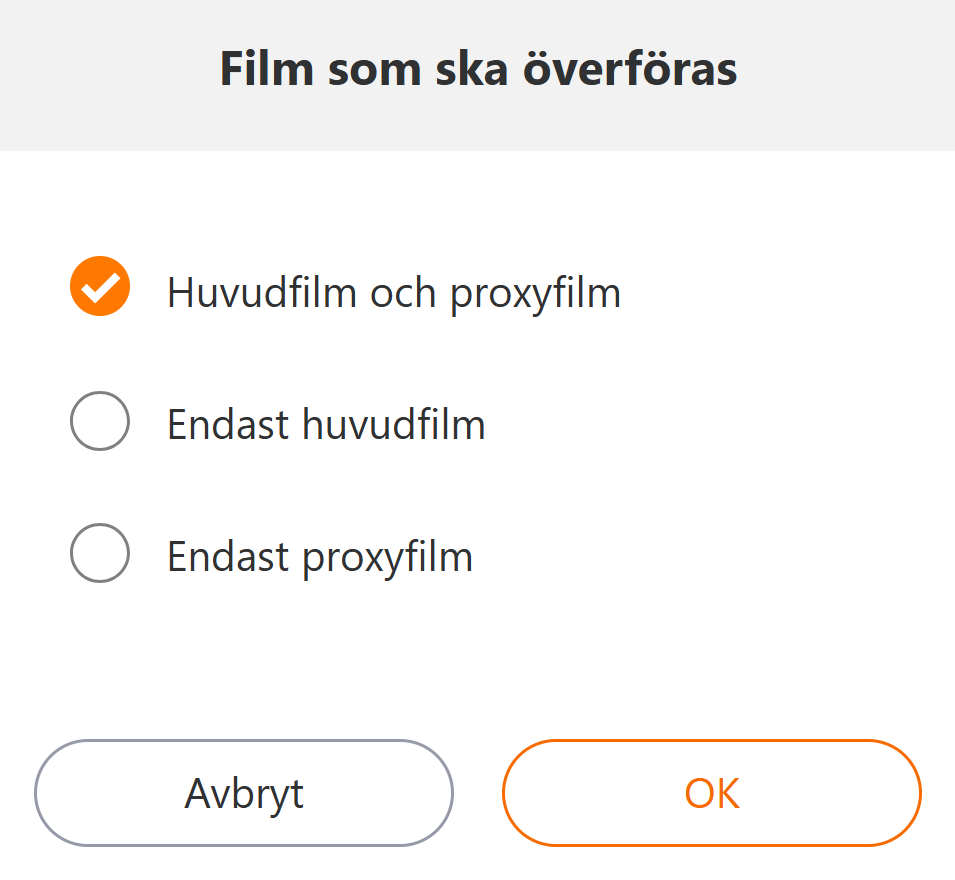 Välj om huvudvideon eller proxyvideon ska överföras när videofilen laddas upp. Endast modeller som stöder proxyvideor kan laddas upp.