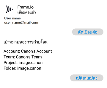เปิดหน้าจอการตั้งค่า Frame.io และเลือก "เปลี่ยน" เป็นปลายทางการโอนย้าย