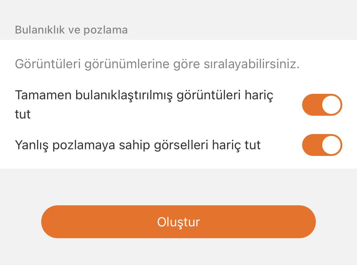 Kamera titremesi veya diğer nedenlerden dolayı odak dışı olan görüntüleri sıralayabilirsiniz. Görüntünün hiçbir yerinde odak dışı olan görüntüler bulanık olarak tanımlanır. |