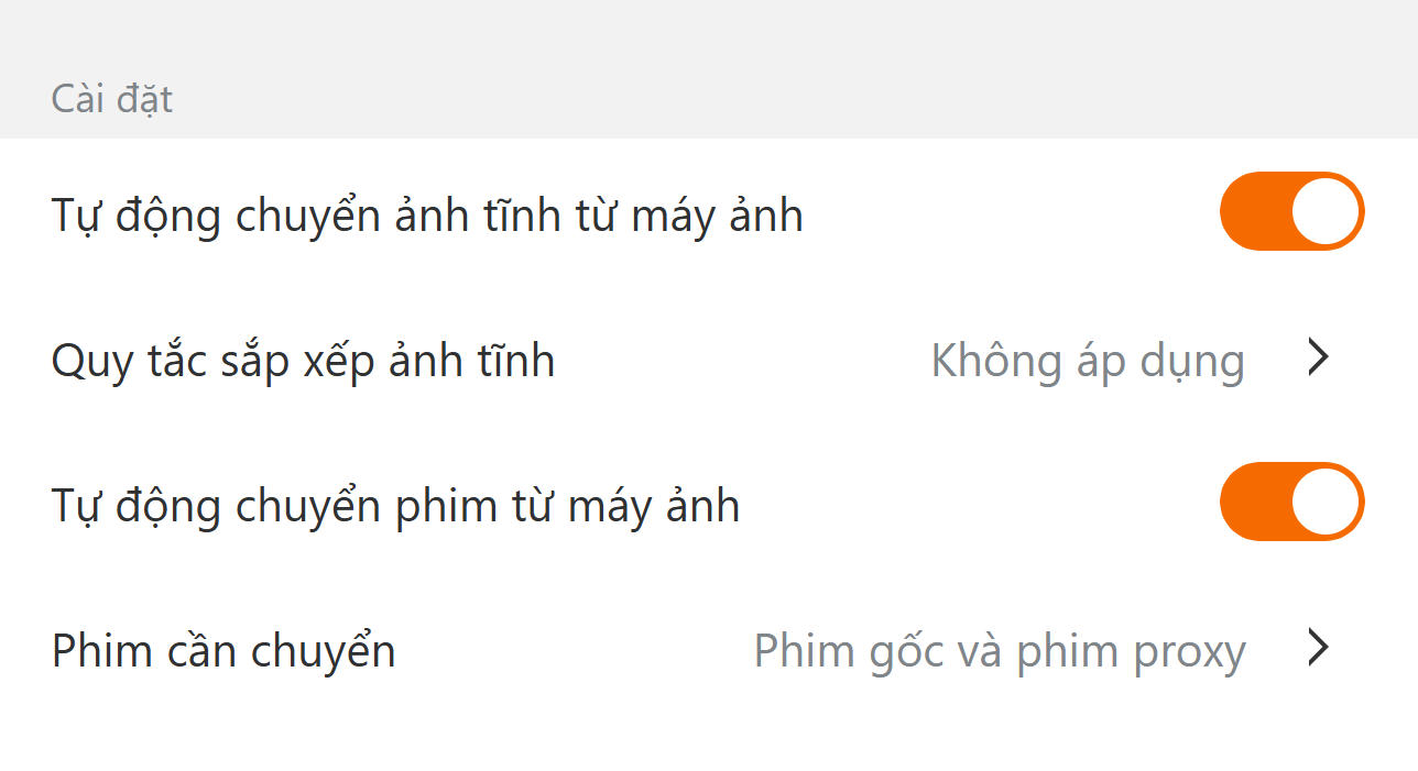 Thiết lập chuyển tự động cho ảnh tĩnh và video riêng biệt. Google Photos chỉ hỗ trợ cài đặt cho ảnh tĩnh.