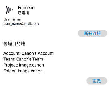 打开 Frame.io 设置界面,选择“更改”作为传输目标位置。