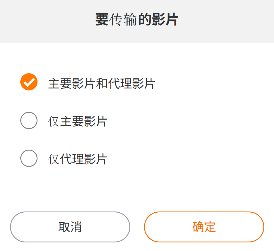 选择上传视频文件时传输主视频还是代理视频。只有支持代理视频的机型才能上传。